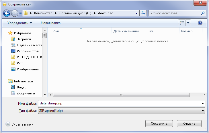 После того, как архив с данными приложения будет сформирован, будет выведен запрос Сохранить как.