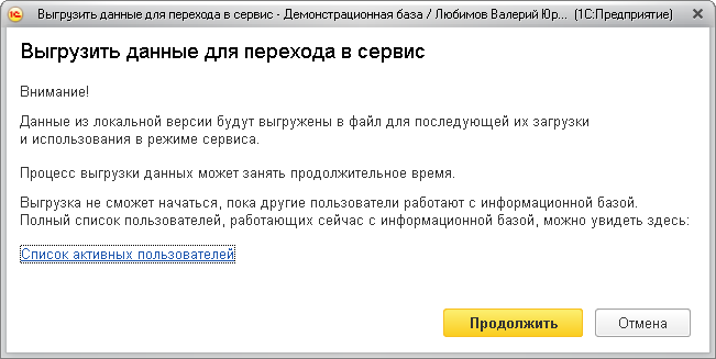 Если в информационной базе работают другие пользователи, будет выведено сообщение об этом. Нужно попросить этих пользователей завершить работу и повторить попытку выгрузки данных для перехода в сервис.
