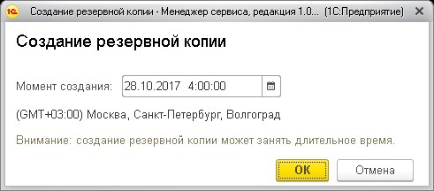 В выведенном окне Создание резервной копии указать время начала создания резервной копии и нажать кнопку ОК.