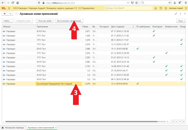 По окончании создания резервной копии сведения о ней появятся в списке Архивные копии приложений, который можно вывести из карточки приложения командой Резервное копирование — Архивные копии приложений: