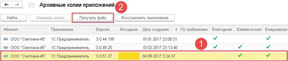Созданные резервные копии приложений хранятся на сервере провайдера сервиса (в «облаке»). Но при желании эти резервные копии можно в любой момент выгрузить (сохранить) на компьютер пользователя. Для этого следует выделить в этом окне нужную резервную копию и нажать кнопку Получить файл.